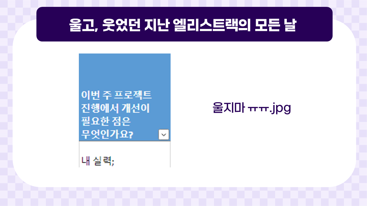 6개월 트랙을 시작하면서 처음엔 그동안 공부를 오래 했는데 배우는 것들이 의미가 없어 시간 낭비가 되지 않을까? 내가 이 6개월 과정을 끝까지 할 수 있을까?라는 의구심이 많았다. 현재 트랙을 마치고 회고해 보았을 때 과거에 나에게 고민할 시간에 해!라고 말하고 싶다. 왜냐하면 내가 그 시간 동안 혼자 공부하는 것보다 트랙에 레이서로 합류하여서 공부한 게 무조건 더 열심히 열정적으로 했다고 생각하기 때문이다. 엘리스 트랙에 참여하면서 그동안 알면서도 열심히 하지 않았던 나를 다잡을 수 있는 시간이었고 시간에 뭐든지 움직이고 뭐든지 해야 한다는 생각이 든 거 같다.