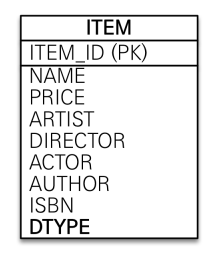 상속 관계에 있는 엔티티의 데이터가 하나의 Item이라는 DB안에 저장됨, 이때 서브타입 컬럼이 모두 Item테이블에 컬럼으로 포함됨