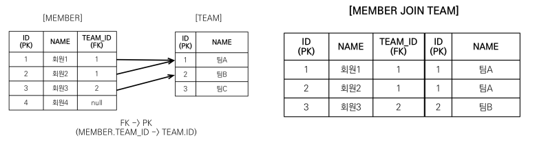 • 여기서는 팀 엔티티만 조회하고, 회원 엔티티는 조회하지 않는다. (Member 테이블의 TEAM_ID만 가져와서 JOIN함)