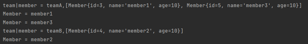System.out.println("member1.getName() , member1.getTeam().getName() = " + member1.getName() + "," + member1.getTeam().getName());