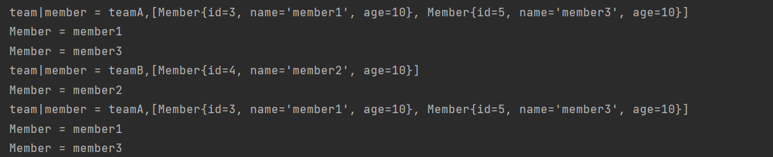 System.out.println("member1.getName() , member1.getTeam().getName() = " + member1.getName() + "," + member1.getTeam().getName());