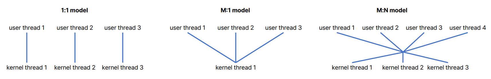 M:1, M:N의 경우 스레드 전환 시에 발생하는 *컨텍스트 스위칭(context switch)이 일어난다
