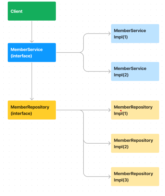그 이유는 MemberServiceImpl이 인터페이스와 구현체 모두에게 의존하고 있는 상황이기 때문이다.