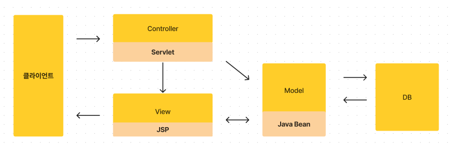 MVC1 패턴은 View와 Controller를 모두 JSP가 담당했었다. JSP가 요청을 받고 응답을 View로 처리하는 구조