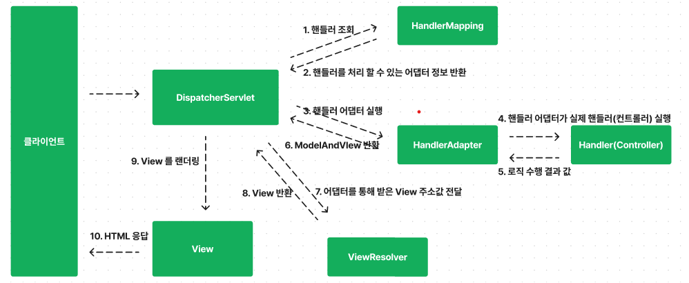 - Handler(Controller)가 해당 요청을 받아 로직을 수행하여 결과를 반환