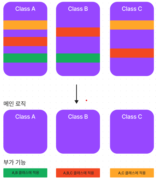 AOP에서의 관점 분리는 이와 같은 패턴으로 되어 있으며 프록시 패턴으로 인해 관심사를 분리하고 역할을 나누었지만