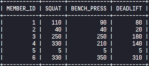 ,(SQUAT+BENCH_PRESS+DEADLIFT) AS WEIGHT_SUM