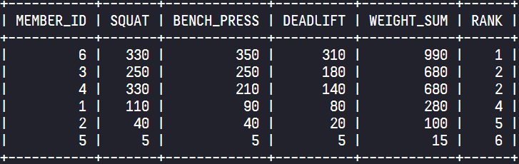 ,RANK() OVER (ORDER BY WEIGHT_SUM DESC)AS RANK //순위 함수