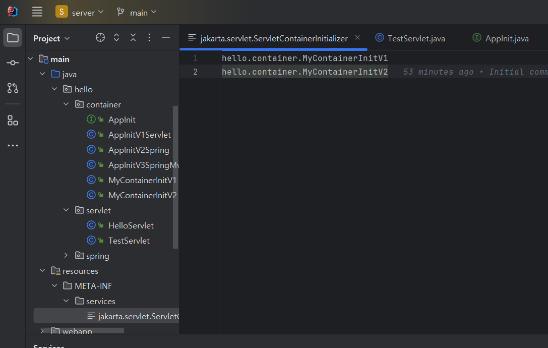해당 컨테이너 초기화 클래스의 정보도 resources/META-INF/services/jakarta.servlet.ServletContainerInitializer 경로에 저장한다.