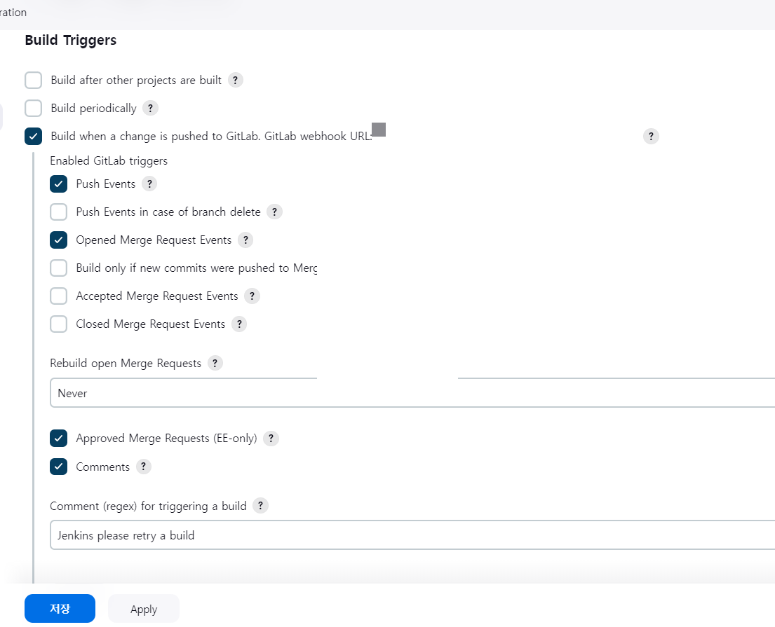 - 젠킨스 GitLab 플러그인을 설치해야 GitLab 웹훅 사용이 가능하다.