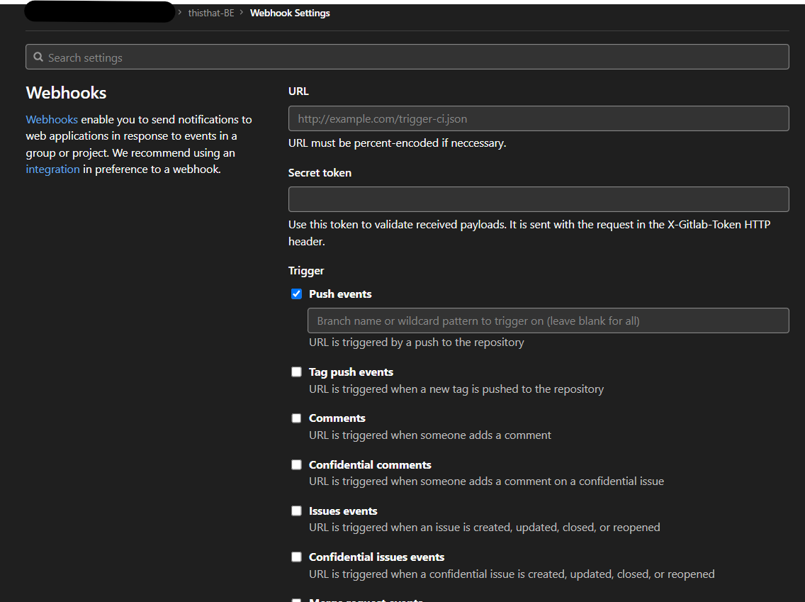 - 깃랩 Repository - settiing - webhooks로 가서 URL과 Secret token에 복사해 둔 정보를 붙여 넣는다.