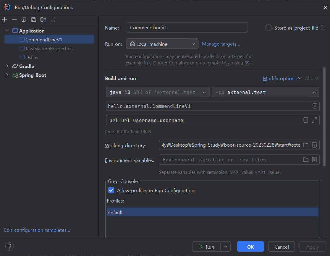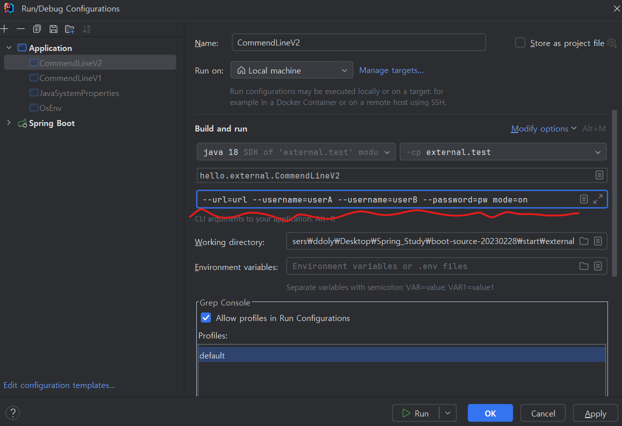 커맨드 라인 옵션인수는 main 메서드가 실행될때 인자로 받는 String[] args 에 값을 주어 설정하는 방법이다.