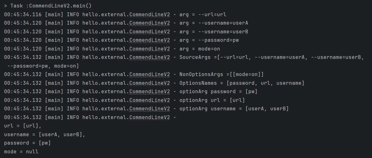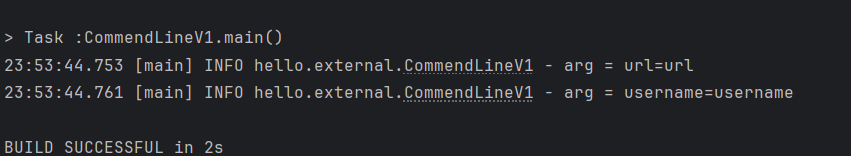 공백 기준의 배열로 값을 받아오는 방식인 커맨드라인 방식을 key value 형태로 받기 위해 스프링에서는 커맨드 라인 옵션인수라는 표준을 만들었다. --key=value 형식으로 사용한다.