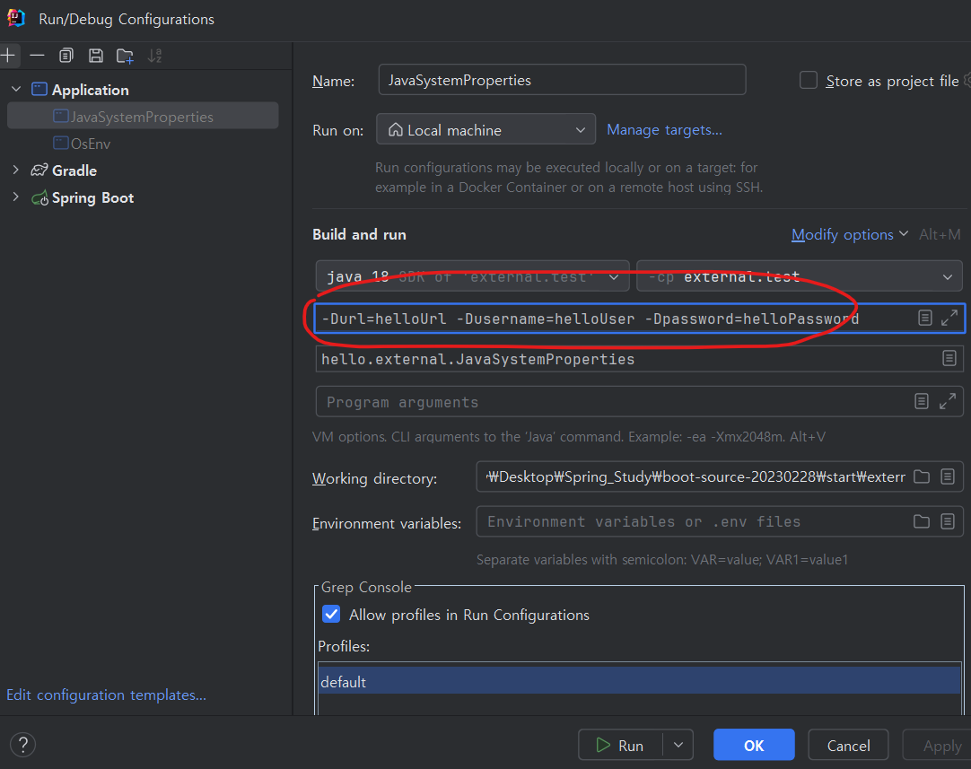 Add VM option에 -D{key}={value} 형식으로 옵션을 주면 해당 설정 값을 받아올 수 있다.