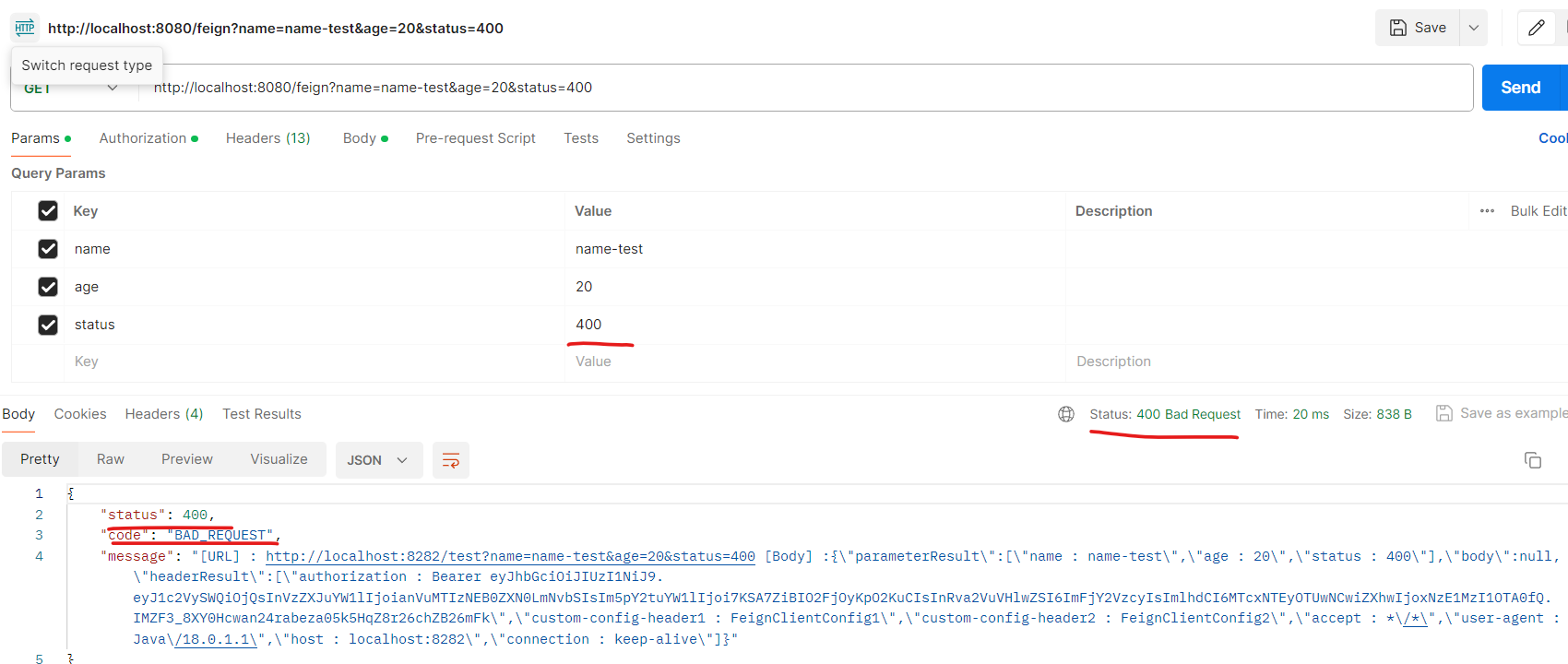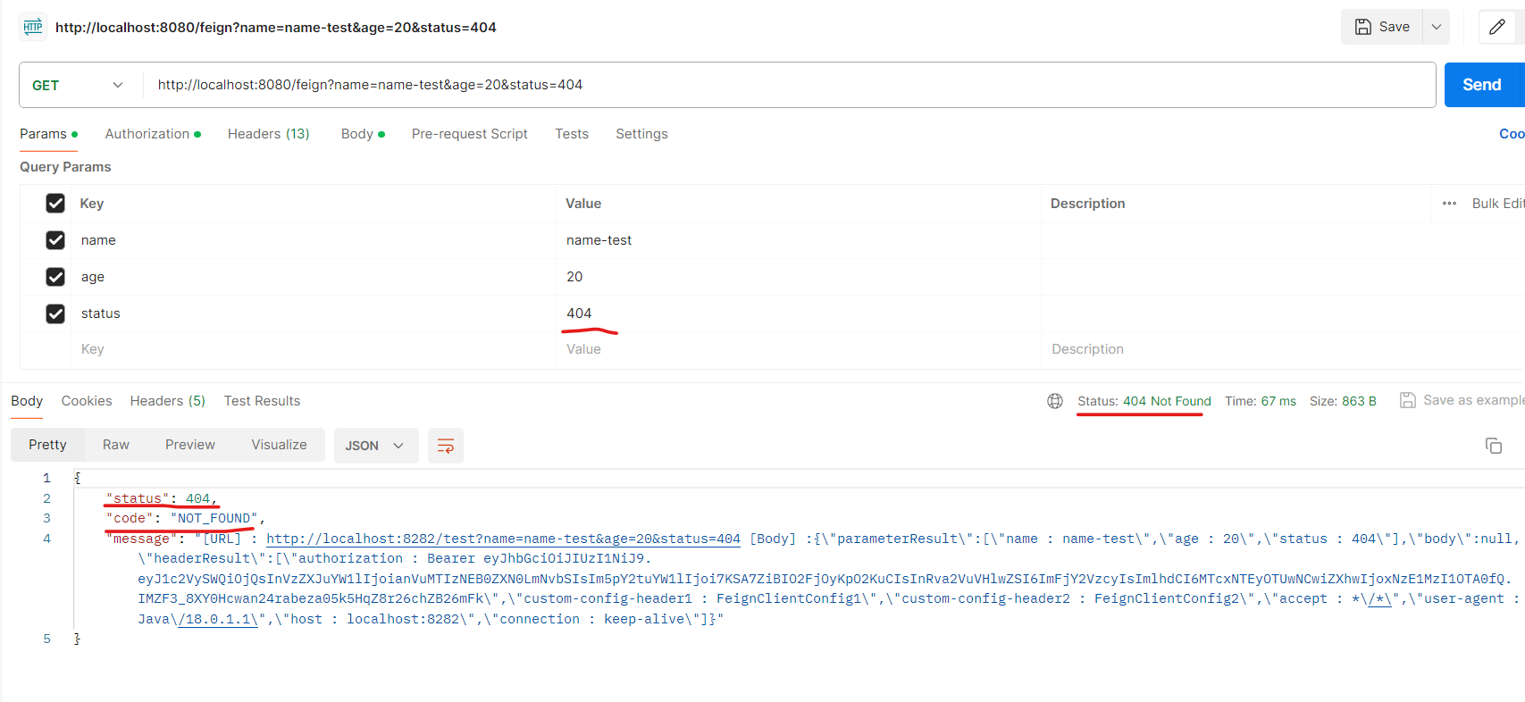파라미터로 status를 받아 그 상태를 그대로 반환하게 설정한 외부 api 애플리케이션에서 404를 반환하였고 다시 받아서 애러 핸들링 한 모습니다.